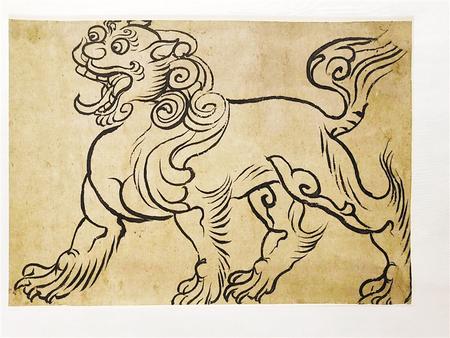 中國本無獅子,原產(chǎn)地是非洲和南美洲,約在漢武帝時才經(jīng)西域傳入。獅子作為進(jìn)獻(xiàn)的禮物,是敦煌壁畫中最早出現(xiàn)的動物形象之一。由于它的勇猛威儀備受佛教推崇,故在造像和壁畫中曾出現(xiàn)大量的獅子元素。除此,獅子形象還被吸納成為陵墓裝飾和傳統(tǒng)建筑的基本元素。這幅紙本畫,造型準(zhǔn)確、健壯飽滿,昂首闊步、氣宇軒昂,線條遒勁、中鋒用筆,彈性十足,顯示出畫家嫻熟的造型功底,長短弧線勾勒卷毛,寥寥數(shù)筆,卻靈動活潑、灑脫不羈,為不可多得之線描精品。