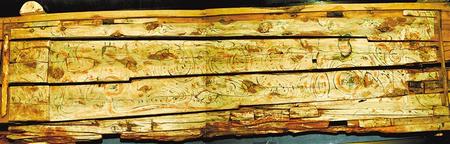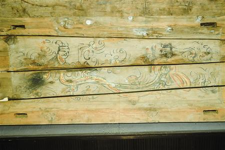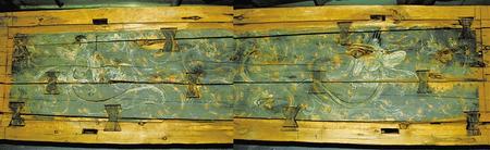 1998年新城魏晉南墓出土。這副完整的木棺由棺身和棺蓋組成,棺蓋內(nèi)側(cè)有一長(zhǎng)方形凹面,內(nèi)彩繪伏羲女?huà)z圖。伏羲女?huà)z人首蛇身,兩尾相交,伏羲在右,左手執(zhí)矩,女?huà)z在左,右手執(zhí)規(guī)。伏羲女?huà)z周?chē)椩茪饧y。棺身呈長(zhǎng)方體,兩檔頭用墨線(xiàn)勾畫(huà)星象圖,棺內(nèi)側(cè)四壁彩繪幃帳、絹帛、蠶繭等圖形。