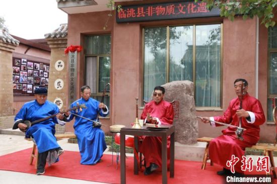 10月12日,甘肅省定西市臨洮縣舉行非物質(zhì)文化遺產(chǎn)展示中心啟動儀式。圖為當?shù)仄び皯騻鞒腥粟w學兵(右二)帶領(lǐng)班社表演影子腔?!堟?nbsp;攝