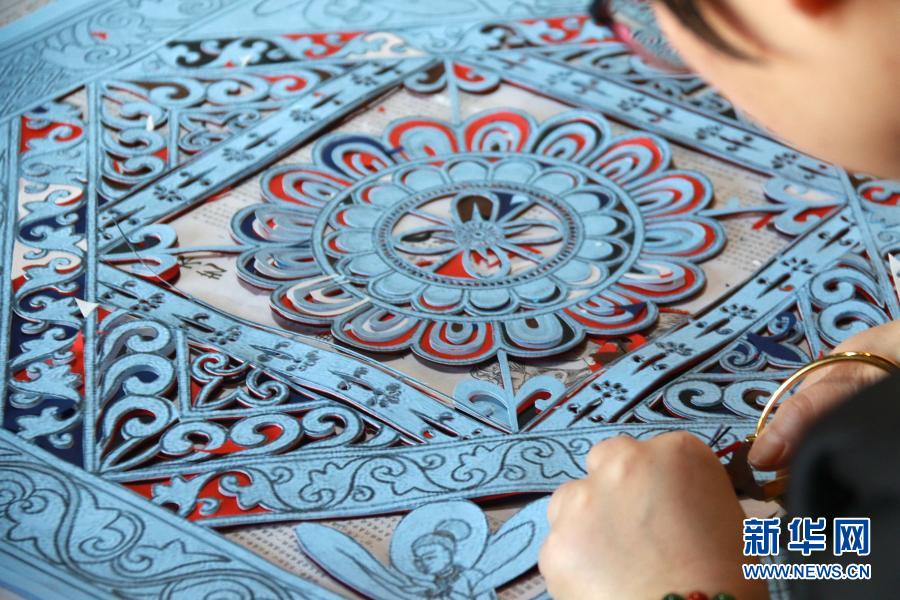 在甘肅敦煌小鎮(zhèn)鳴沙書(shū)院,“敦煌剪紙”酒泉市級(jí)非物質(zhì)文化遺產(chǎn)代表性傳承人莊生娟在自己的工作室內(nèi)創(chuàng)作(2020年12月31日攝)。新華社發(fā)(張曉亮 攝)