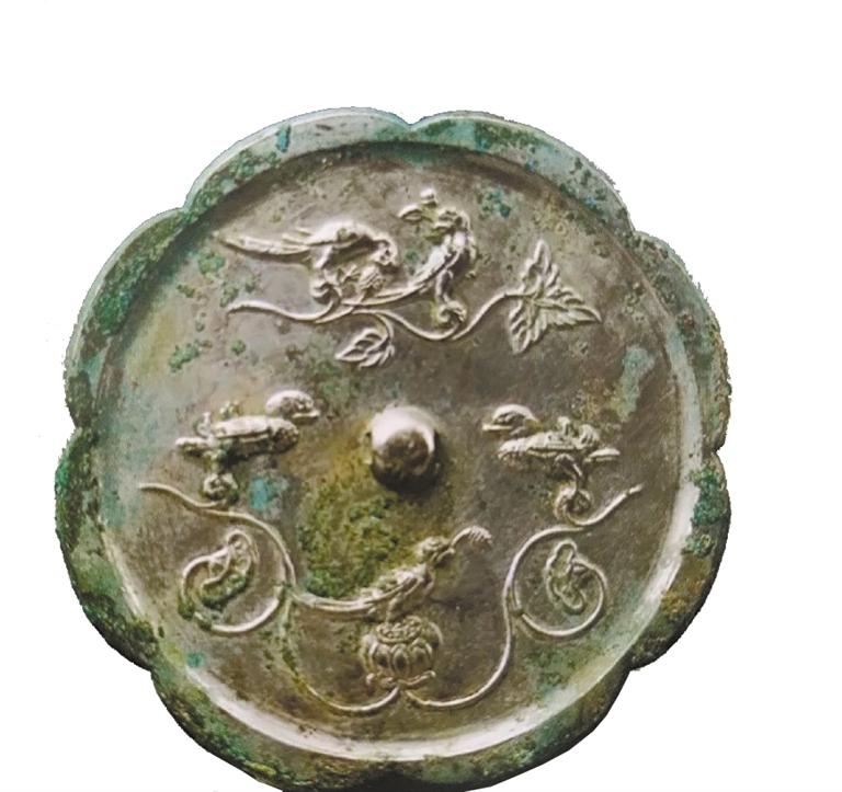 隋唐時期是中國封建政治經(jīng)濟文化高度發(fā)展繁榮的時期,唐代社會經(jīng)濟全面發(fā)展,手工業(yè)各部門也都興旺發(fā)達,青銅鑄造業(yè)中的銅鏡業(yè)尤為突出,無論造型、題材、紋飾、鑄造工藝,都突破了前代的模式,達到了中國古代銅鏡藝術(shù)的巔峰。唐鏡鏡型厚實,方形鏡、菱花形鏡、葵花形鏡流行;紋飾題材多見瑞獸、飛鳥以及葡萄、花草等;瑞獸葡萄鏡最具特色,是中西文化融合的杰作。