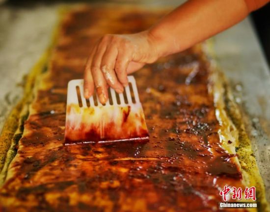 圖為面劑被涂上胡麻油,切成條狀用作月餅的花型制作。張文 攝