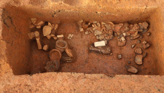 考古調(diào)查初步判斷南佐遺址面積約600萬平方米,年代距今5200年至4600年。遺址核心區(qū)由9座大型夯土臺(tái)圍合,面積約30萬平方米,緊鄰夯土臺(tái)外側(cè)發(fā)現(xiàn)2道環(huán)壕,核心區(qū)東、南、北三面約1000米處還發(fā)現(xiàn)外環(huán)壕遺跡,但目前尚不能確認(rèn)為封閉的環(huán)壕。2021年考古調(diào)查初步了解1號夯土臺(tái)殘存面積約880平方米、殘高2-3米。核心區(qū)北部發(fā)現(xiàn)大型建筑基址、聯(lián)排房屋等重要遺跡,其中大型建筑F1包括前廳、后堂,僅室內(nèi)面積已達(dá)630平方米,墻壁、地面均為多層白灰面;F2出土白色堆紋陶、白衣陶、白陶、黑陶、朱砂彩繪陶,大型彩陶罐、帶塞蓋喇叭口平底彩陶瓶以及大量水稻遺存,顯示了較高的社會(huì)發(fā)展水平。