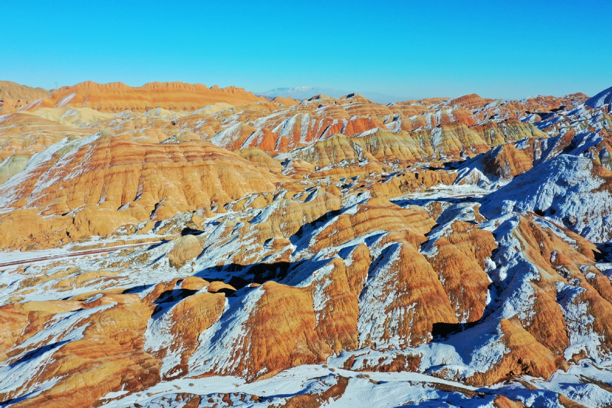 2021年12月12日,甘肅省張掖七彩丹霞在白雪的映襯下,層理交錯、色彩斑斕,顯得格外艷麗多彩、美輪美奐。