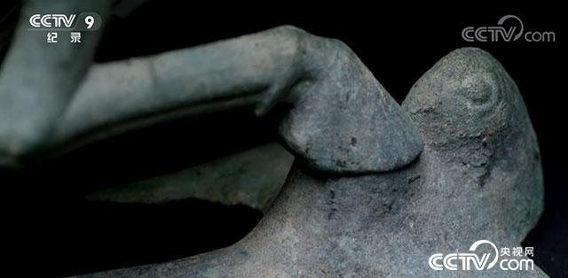我整器由馬與飛鳥(niǎo)構(gòu)成,一匹正在急速飛奔的駿馬,身高34.5厘米,身長(zhǎng)45厘米,全身呈流線型,肌肉健碩有力。馬的三足騰躍在空中,一足踏上飛鳥(niǎo)。飛鳥(niǎo)不知后面追上來(lái)的是什么,驚回首的一剎那間,馬已經(jīng)超在了前面,這馬踏飛燕(馬超龍雀)夢(mèng)幻般的瞬間被定格成為永恒。
