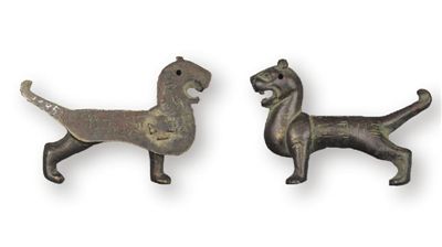銅虎符(圖③)高4.7厘米、長(zhǎng)6.9厘米。虎圓豎耳,怒目張口,挺胸昂首,尾上翹,作奔走狀。符頭部有圓穿孔,背面有凸起的十字扣。符身正面陰刻篆書(shū)“永安府”字樣,背面陰刻楷書(shū)“右翊衛(wèi)”“右驍衛(wèi)”“永安四”“蘭豐二”等字樣。右翊衛(wèi)、右驍衛(wèi),官署名,為隋唐十六衛(wèi)中的兩衛(wèi)。隋初稱左右衛(wèi),隋煬帝時(shí)改為左右翊衛(wèi),所領(lǐng)軍士稱驍騎。館藏虎符出土于甘肅莊浪,是隋代府兵駐防莊浪的歷史見(jiàn)證,是研究隋代府兵制度的重要實(shí)物資料。