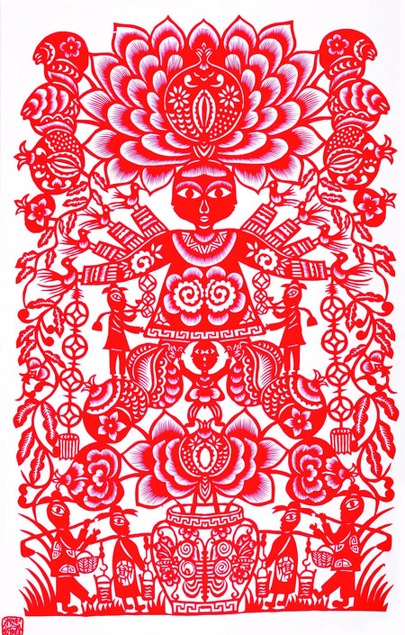 剪紙藝術題材多體現(xiàn)在祈福求安、避邪娛樂、孝道祭祀、喜事慶賀等等,例如五福娃娃、連年有余、大紅喜字、剪紙風格也多樣化、多元化,剪紙作品一般初期主要是以對稱圖案為主,中后期主要發(fā)展成人物頭像、大型復雜圖案畫及反映和宣傳時代氣息的、人們喜聞樂見的多元素圖案,也將古代藝術和現(xiàn)代特征結合起來給人渲染一種藝術美、社會美、時代美的視覺欣賞、其作品妙趣橫生,秀美遒勁,雄渾大氣,喜聞樂見,愛不釋手,廣泛流傳在城鄉(xiāng)之間。當下,剪紙藝術作為非物質文化遺產,深受社會各個階層的人士喜愛,把剪紙精神發(fā)揚光大。傳承非遺,是我們共同的使命。