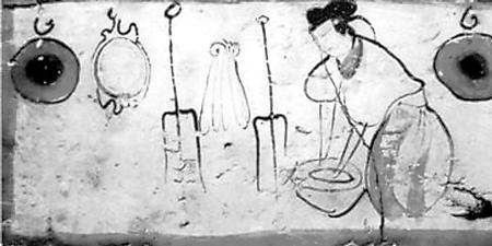 糧食、蔬菜品種與前代相比沒有大的變化,仍是漢地人的主要經(jīng)濟和衣食來源。烹飪方法,這一時期出現(xiàn)了面粉發(fā)酵技術。北魏賈思勰介紹發(fā)面技術說:“面一石,白米七八升作粥,以白酒六七升酵中,著火上,酒魚眼沸,絞去滓,以和面,面起可作”(《齊民要術》卷9)。把北魏時期的容量數(shù)換算成今天的市斤,上段話的意思就是,用五十多斤面粉,五六斤白米做粥,再用四五斤白酒(甜米酒)做酵母,將酒架火上燒至發(fā)出魚眼樣的小泡后,濾去酒渣,加入面粥中發(fā)酵,等面發(fā)起后就可以做餅了。這是一項歷史性的烹飪技術。從發(fā)面的數(shù)量看,一次發(fā)這樣多面的家庭,至少有三五十口人,顯然是當時世家大族的人口規(guī)模。世族如此,普通民眾也應很快就學習掌握了發(fā)面技術。