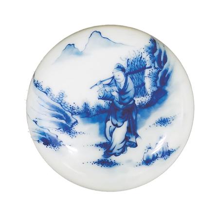 一件是青花印泥盒,制作于20世紀(jì)初。直徑7厘米,高3厘米,盒身扁圓,鼓腹,上下相合。盒蓋用青花繪“樵夫讀書”圖。畫面遠(yuǎn)處,兩座山峰高聳云間,四周樹木蔥蘢,山石嶙峋。畫面正中的山路上,一樵夫砍柴歸來,身背一大捆柴草,他右手扶著木棍,左手則捧著一本書,雙眼盯著書本,緊抿嘴唇,正津津有味地邊走邊讀。讀到精彩處,露出會心一笑??磥?,這個樵夫是極愛讀書的,這種好學(xué)精神,難道不值得我們學(xué)習(xí)嗎?這件瓷印泥盒,青花色澤典雅,人物衣褶神態(tài)描繪細(xì)致,栩栩如生,胎體堅致,白釉溫潤,層次清晰,保存完好。