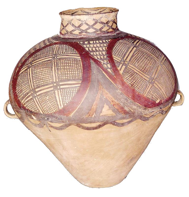 姓名:馬家窯文化半山類型四大圓圈雙耳彩陶罐 出生年代:距今約4650—4350年左右 住址:永靖縣博物館 體型:高46.6厘米,口徑15.6厘米,底徑12.2厘米 自我描述: 我是半山類型中的精品,屬于國家一級(jí)文物。泥質(zhì)紅陶,口沿微侈,直粗頸,闊肩,鼓腹,平底,腹有對(duì)稱雙耳,施黑紅彩,內(nèi)口飾水波紋六組,外口飾網(wǎng)紋,肩腹飾四大圓圈旋渦紋,間飾弧線鋸齒紋,腹中部飾寬帶紋,水波紋各一條,器型個(gè)體較大,胎體光滑,紋飾精致,色彩鮮艷。