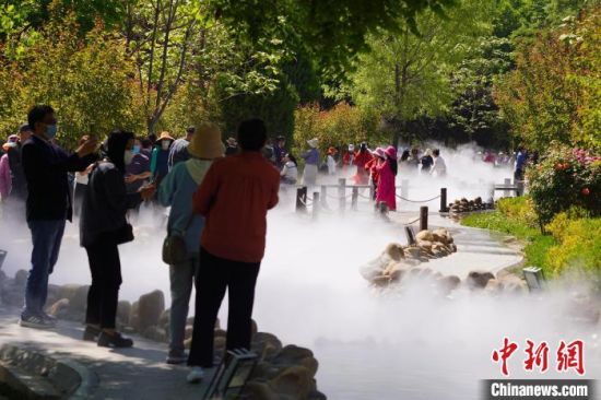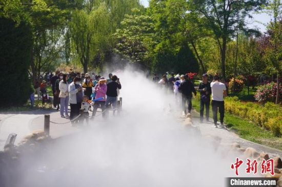 5月16日,甘肅蘭州,寓言故事園化身“瑤池”仙境美景,吸引不少市民前來(lái)觀賞、拍照。