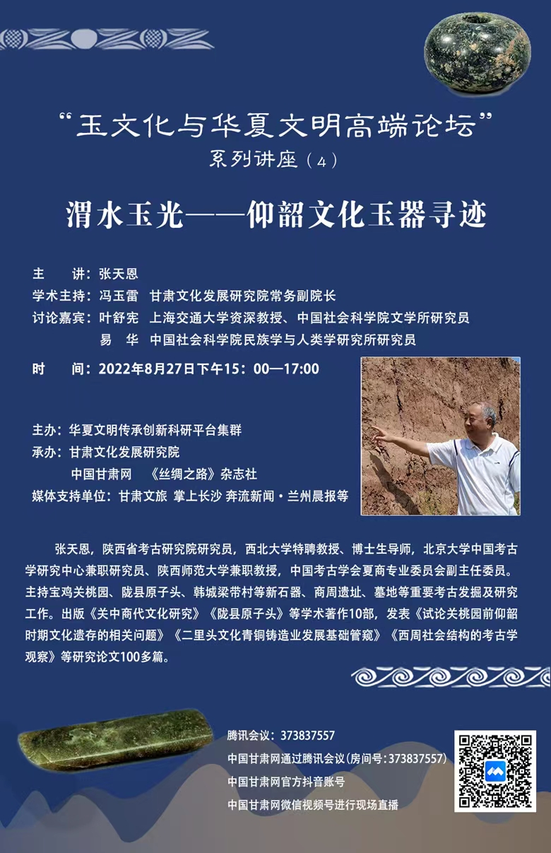 中國甘肅網(wǎng)8月28日訊  27日下午15:00—17:00,由西北師范大學(xué)華夏文明傳承創(chuàng)新科研平臺集群主辦,甘肅文化發(fā)展研究院、中國甘肅網(wǎng)、《絲綢之路》雜志社聯(lián)合承辦的“玉文化與華夏文明高端論壇”第四講《渭水玉光——仰韶文化玉器尋跡》成功舉辦。
