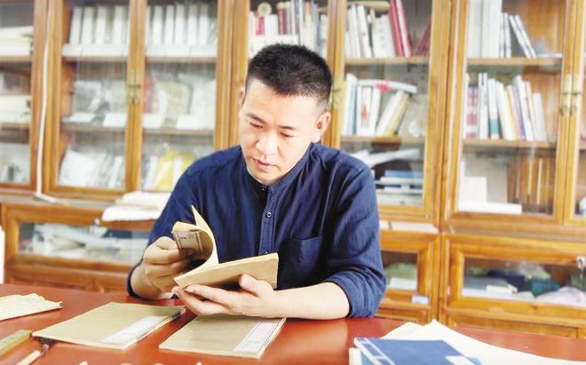 他一邊輕輕撥弄著桌案上泛黃的紙頁,一邊用毛筆蘸上漿糊,粘補(bǔ)書頁上的缺損部分。