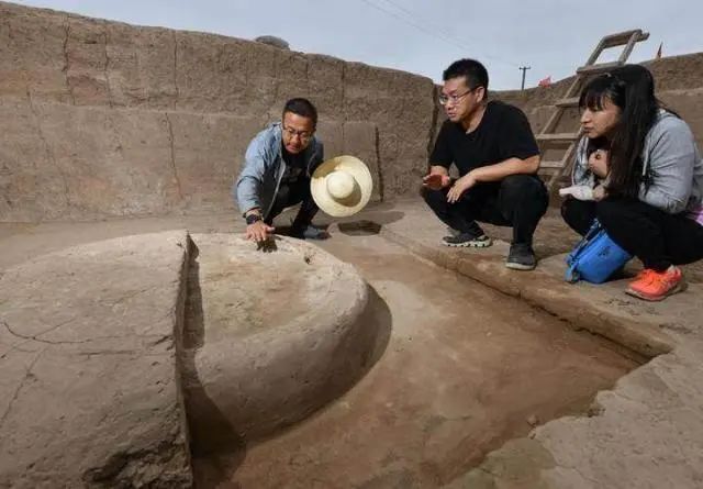 考古工作人員在展示南佐遺址內(nèi)出土的帶有蓋塞的彩陶小口細頸平底瓶(8月25日攝)。新華社記者 李賀 攝