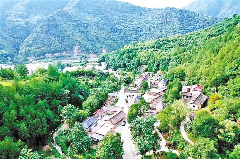 路高河低,村落成袋子狀布局。陽光下河流像是供村莊梳洗打扮的銅鏡。村舍和郁郁蔥蔥的雜樹在水中若隱若現(xiàn)。周遭高聳的群山呈浪頭般錯落著,給村莊形成了一個綠色的屏障。