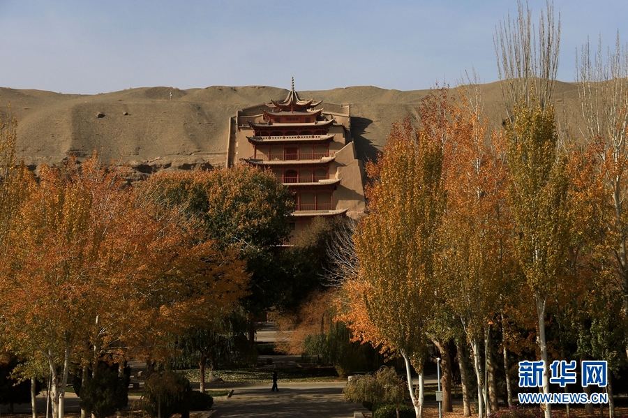 深秋時節(jié),世界文化遺產(chǎn)甘肅省敦煌市莫高窟盡染秋色,景色迷人,美不勝收。