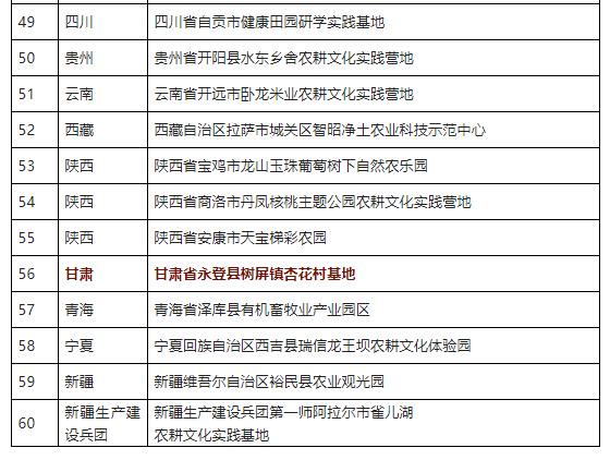 日前,農(nóng)業(yè)農(nóng)村部、共青團(tuán)中央、全國少工委組織開展了農(nóng)耕文化實踐營地推薦工作。經(jīng)過逐級推薦、材料審查、專家評審和網(wǎng)上公示,全國農(nóng)業(yè)展覽館(中國農(nóng)業(yè)博物館)等60個單位為農(nóng)耕文化實踐營地,甘肅省永登縣樹屏鎮(zhèn)杏花村基地入選。