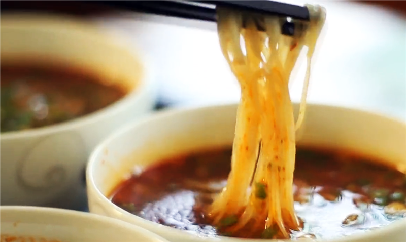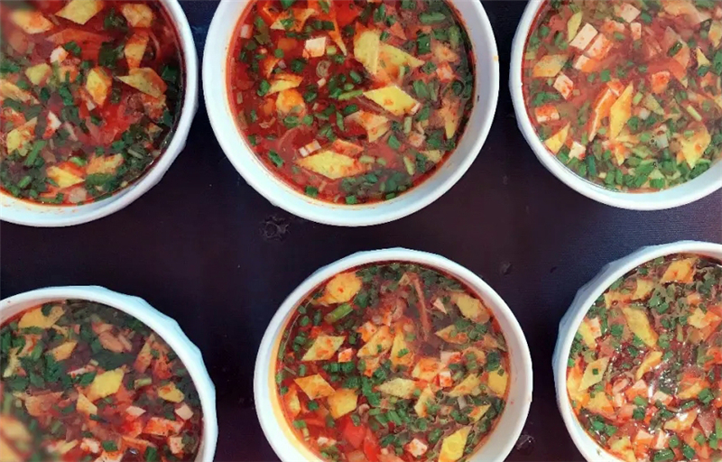 盛一碗細(xì)面,再澆些許酸湯,酸中帶辣、柔軟耐嚼、湯香撲鼻,開胃爽口、色香味俱佳。特別是夏季時(shí)分,一碗酸湯面絕對是開胃醒腦又提神的不二之選。