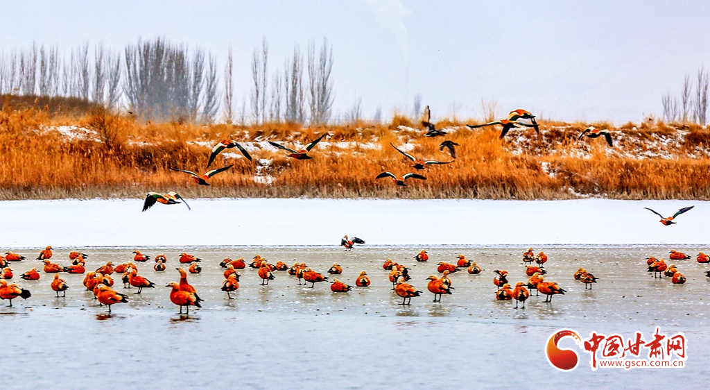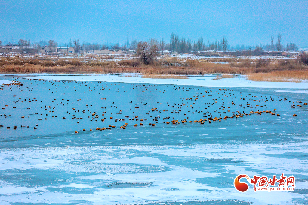 12月20日,在甘肅省酒泉市銀達(dá)鎮(zhèn)花園水庫,一群候鳥正在戲水、覓食,為祁連山下的戈壁大地增添了一道亮麗的景色。