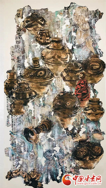 他的這幅作品《絲路遺珍-馬家窯》于2018年獲甘肅美術(shù)專業(yè)最高獎(jiǎng)“金駝獎(jiǎng)”,采用黃河的“s”型構(gòu)圖展開,將八千年前新石器時(shí)代大地灣文化、馬家窯文化的經(jīng)典代表器物分次展開。作品左上角及中間部分依次疊加,穿插,繪制中與敦煌文化中的壁畫、飛天、佛像有機(jī)結(jié)合,寓示絲路文化有序傳承、源遠(yuǎn)流長,又對畫面的視覺撥高提升。