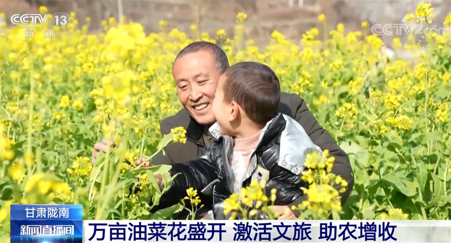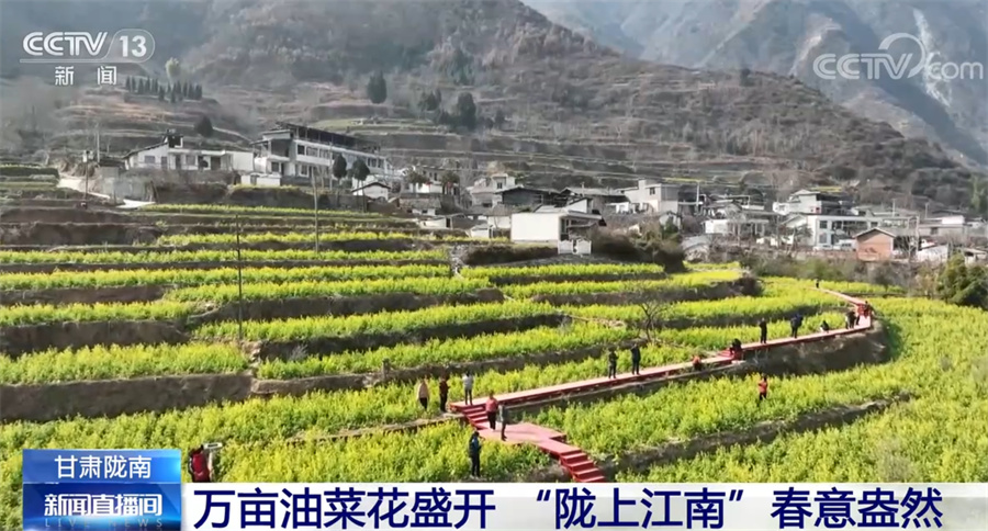 總臺(tái)記者 項(xiàng)思:這里是甘肅省隴南市文縣,位于甘肅的最南端,也是甘肅最早迎來(lái)春天的地方。一江碧水、兩岸青山,大面積盛開(kāi)的油菜花迎著和煦的春風(fēng)泛起金色的波浪,一股濃烈的春天氣息撲面而來(lái)。從春節(jié)前10天左右,這里的萬(wàn)畝油菜花就陸續(xù)開(kāi)放了。如今步入春天,油菜花已進(jìn)入盛花期。文縣接壤四川,嘉陵江的上游白龍江穿越境內(nèi),氣候溫暖潮濕,具有夏無(wú)酷暑、冬無(wú)嚴(yán)寒的氣候特點(diǎn),被稱為“隴上江南”。
