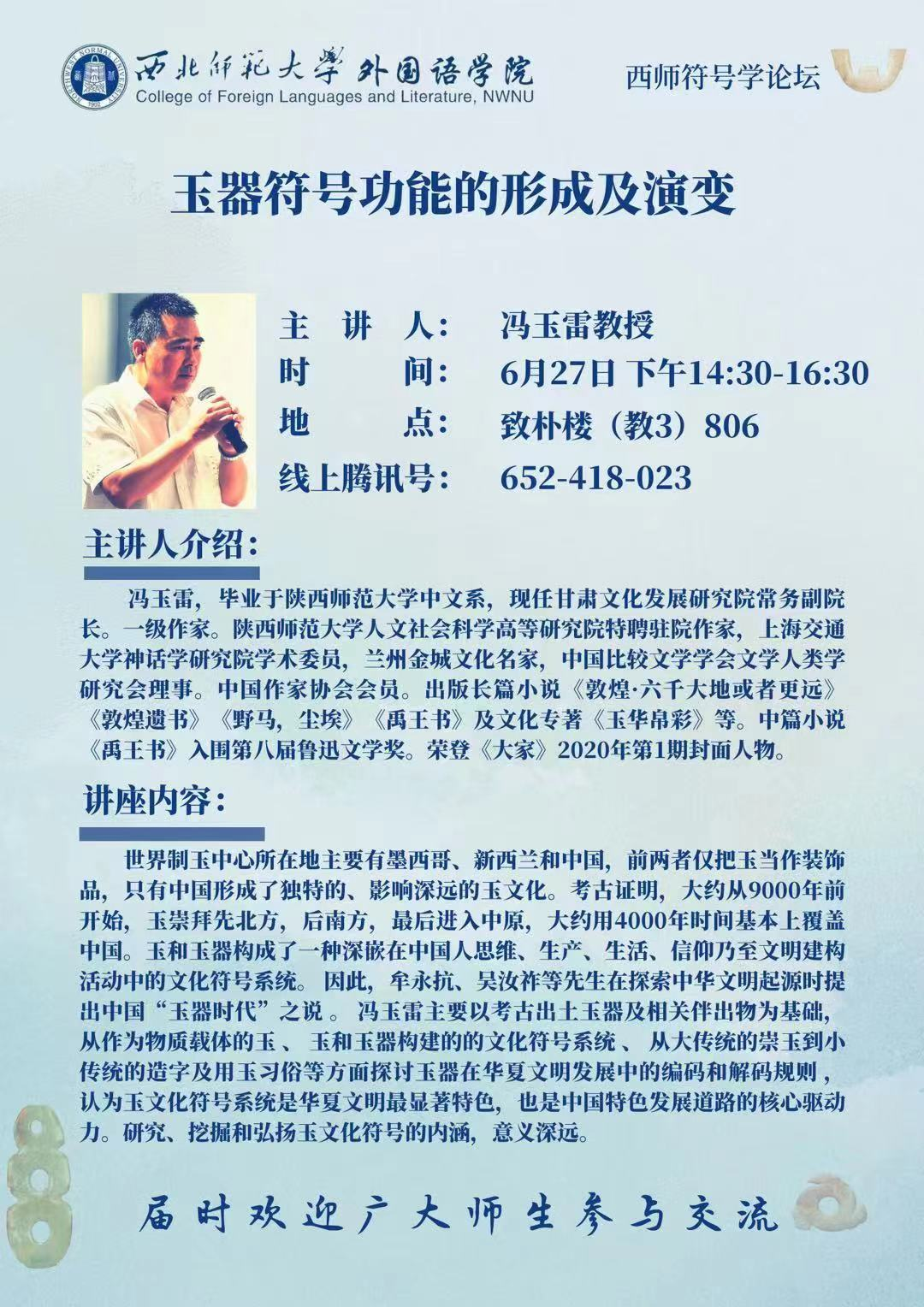 由甘肅文化發(fā)展研究院常務(wù)副院長、一級作家馮玉雷主講的《玉器符號功能的形成及演變》將于6月27日下午在西北師范大學舉辦。此項活動是西北師范大學外國語學院西師符號學論壇系列講座之一,旨在促進玉文化與符號學的融合研究。