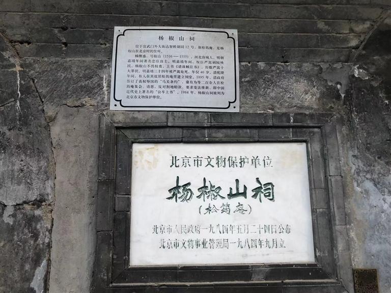 就是在這個胡同里,我看到一個歇山式屋頂?shù)姆课荩严喈?dāng)?shù)钠茢?,屋頂上長滿了凄凄荒草,門窗皆已破爛不堪。但是門旁的墻壁上卻鑲嵌著一塊匾,近前一看,上面寫著“楊椒山祠”。喲,這就是楊椒山在北京的祠。