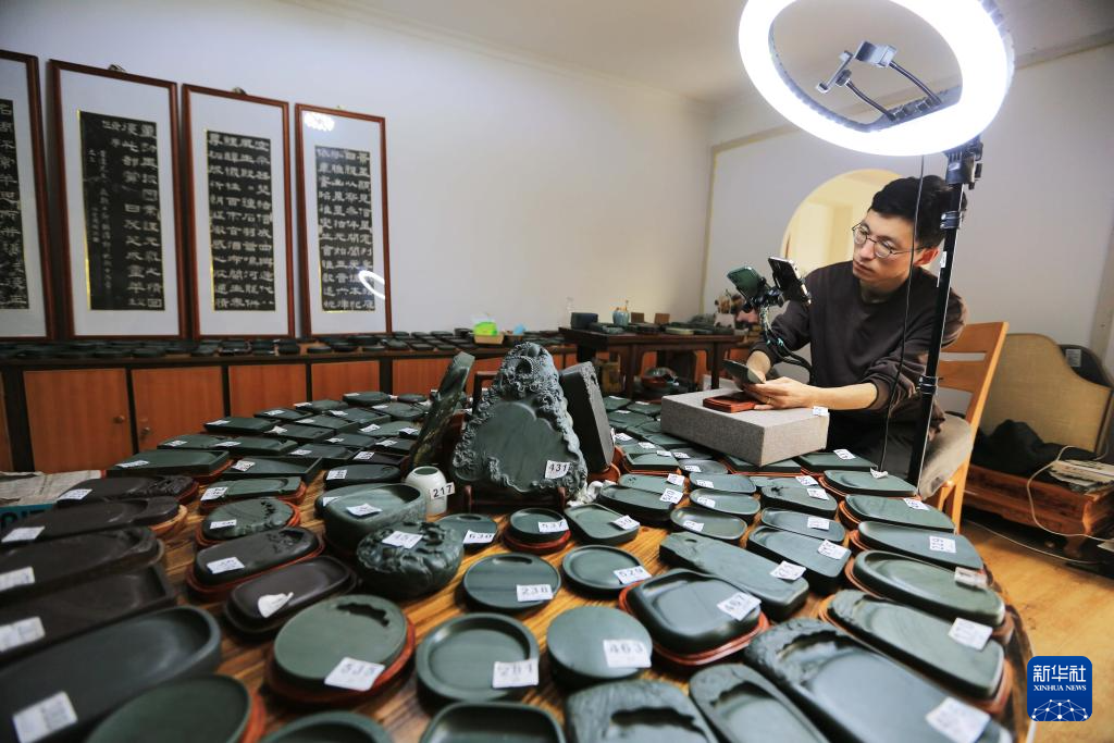 10月24日,工作人員在甘肅省定西市臨洮縣直播銷售洮硯。新華社發(fā)(王克賢 攝)