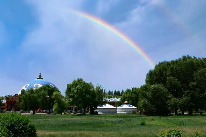 余每遙望心儀卻不能至的彩虹,常憶陸游《秋思》詩句:“天際掛虹初斷雨,云頭翳日又成陰。”秋游包頭賽汗塔拉(1),卻出人意料地邂逅可望亦可即的彩虹。經(jīng)當?shù)赜讶艘I乘興疾步入彩虹落腳處,大異既往定見,歸作以志其趣。