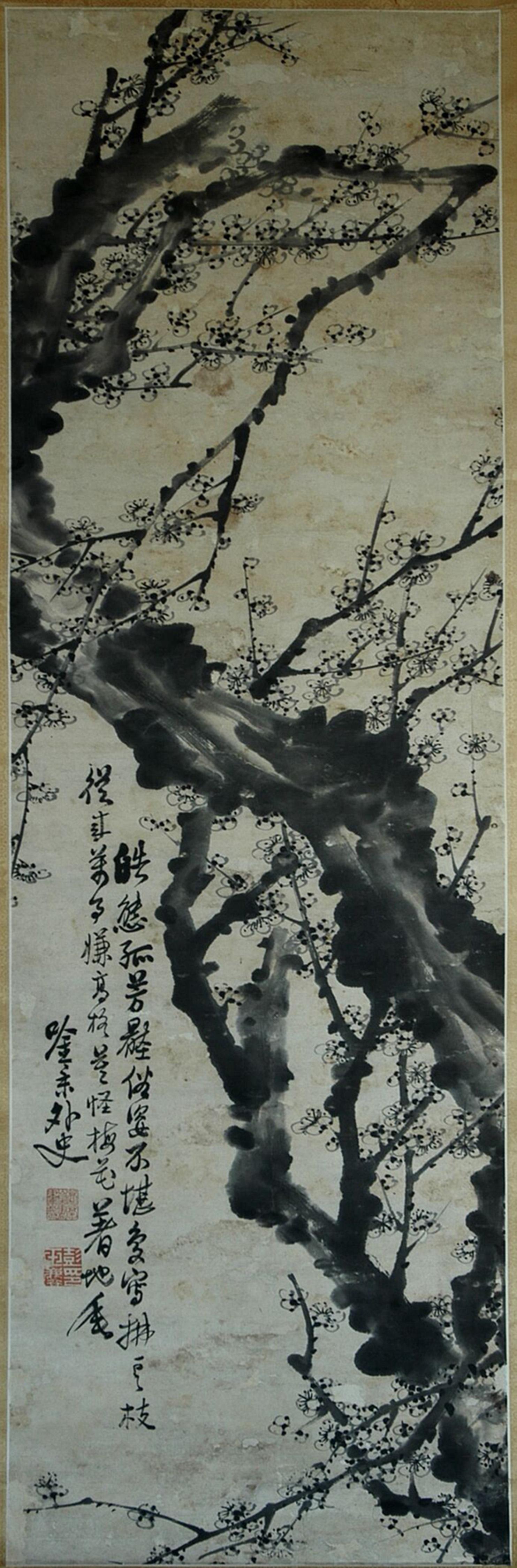 彭玉麟一生所作梅花不下萬(wàn)幅,清水縣博物館館藏的這幅梅花圖屬館內(nèi)舊藏,其來(lái)歷已無(wú)從考證。這幅立軸梅花圖長(zhǎng)133厘米,寬42厘米。畫面上,一棵下不見根底的老梅,蜿蜒盤旋凌空而上,好似神龍擺尾,顯得古拙蒼勁,點(diǎn)點(diǎn)梅花用寫意筆法一揮而就。畫作不著顏色,老干繁枝,遒勁如鐵,寒梅點(diǎn)點(diǎn),暗香浮動(dòng),散發(fā)著濃厚的文人畫氣息。