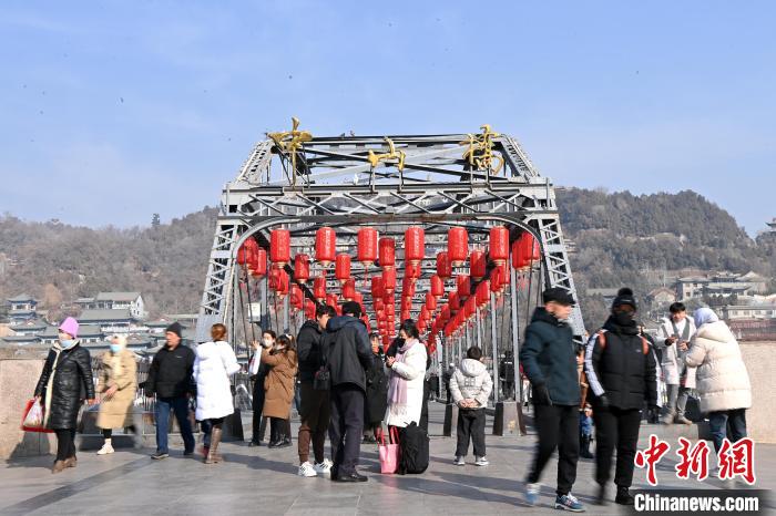 1月30日,新春將至,有“天下黃河第一橋”之稱的蘭州中山鐵橋上掛滿了紅燈籠,黃河畔年味漸濃,引得游人駐足觀賞拍照。九美旦增 攝