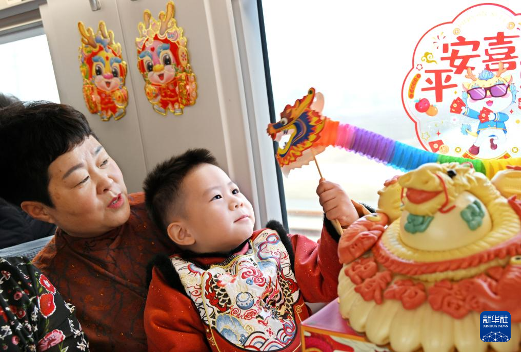當(dāng)日,中國鐵路濟(jì)南局集團(tuán)有限公司青島客運(yùn)段在齊魯環(huán)游線G6955次列車上開展“年俗非遺進(jìn)高鐵”活動(dòng),讓旅客在旅途中感受傳統(tǒng)文化的魅力,營造濃郁的節(jié)日氛圍。
