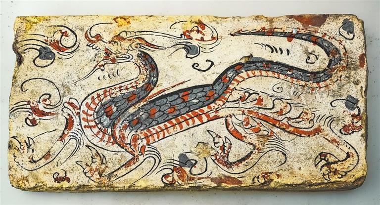 中國人恪守天人合一、陰陽平衡、五行生克的風(fēng)水理論,風(fēng)水中龍脈對(duì)人心理的影響深遠(yuǎn),使得龍?jiān)诮ㄖb飾、墓葬中普遍應(yīng)用,成為中國建筑裝飾藝術(shù)的瑰寶。隨著兩漢磚室墓的出現(xiàn)和流行,由星辰崇拜衍生而來的四靈形象,逐漸成為墓葬建筑裝飾的重要元素,如金昌市博物館藏的魏晉青龍磚,龍首高昂,龍須上揚(yáng),曲頸挺胸,張口吟嘯,前肢登騰,后肢做行進(jìn)狀,周圍環(huán)繞云氣紋,有隨云彩而飛動(dòng)之感。
