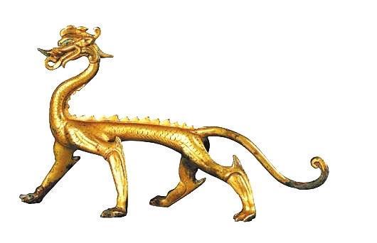 河南偃師的二里頭遺址出土了夏代龍文物,說明此時(shí)龍已經(jīng)成為身份、地位的象征。商代開始,龍的突出特征便是有了角,并多以夔龍紋等形象出現(xiàn)在青銅器上。春秋戰(zhàn)國時(shí)代是一個(gè)大變革、大發(fā)展的時(shí)代。與政治上諸侯爭雄、思想界百家爭鳴、陰陽學(xué)說盛行相適應(yīng),龍的圖案中出現(xiàn)了“群龍”和“交龍”形象。如甘肅省博物館收藏的戰(zhàn)國盤龍紋金飾片,兩條龍交叉盤繞,龍首一側(cè)飾兩條小龍,龍尾一側(cè)飾一對(duì)小虎,作咬噬龍尾狀,龍身上飾聯(lián)珠紋。隨著華夏大地結(jié)束戰(zhàn)亂,走向一統(tǒng),秦漢時(shí)代的龍出現(xiàn)相對(duì)規(guī)范和定型的趨勢(shì),并出現(xiàn)了背上長翅膀的龍。魏晉南北朝時(shí)期龍形象對(duì)內(nèi)融合各少數(shù)民族文化,對(duì)外融合佛教文化,流行的龍紋頭部扁長,角似鹿角,發(fā)鬣后披,挺胸奮肢,呈現(xiàn)出矯健奔放、線條流暢、氣韻生動(dòng)的特點(diǎn)。