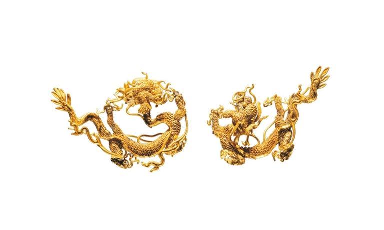 甘肅省博物館藏的明代累絲金龍,龍首聳額巨目,鬣發(fā)飛揚(yáng),神情兇猛;龍足屈伸相應(yīng),利爪如鉤;龍身似盤似舒,蜿蜒多態(tài);龍尾分叉,形狀如葉,輕輕擺動(dòng),飄帶般長須刻畫出金龍瀟灑自由的雄姿。
