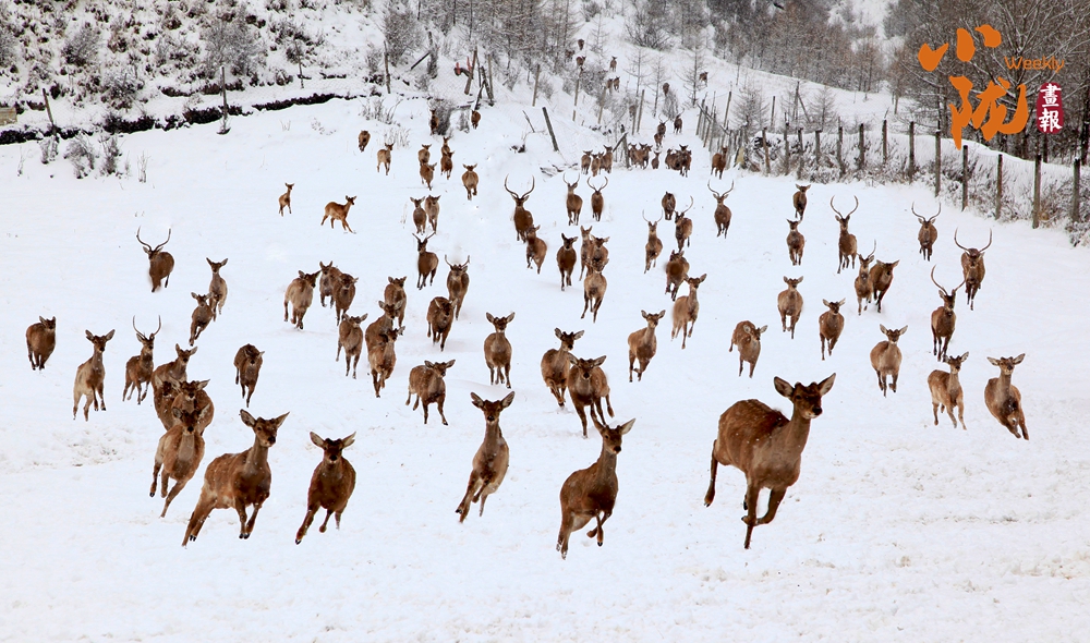 雪滿山川,素白沉靜。關(guān)灘溝鹿場(chǎng)的梅花鹿,在躲了一夜的風(fēng)雪后成群結(jié)隊(duì)出來,或是雪中覓食,或是雪中撒歡,它們活潑的嬉戲好一幅祥和畫面。