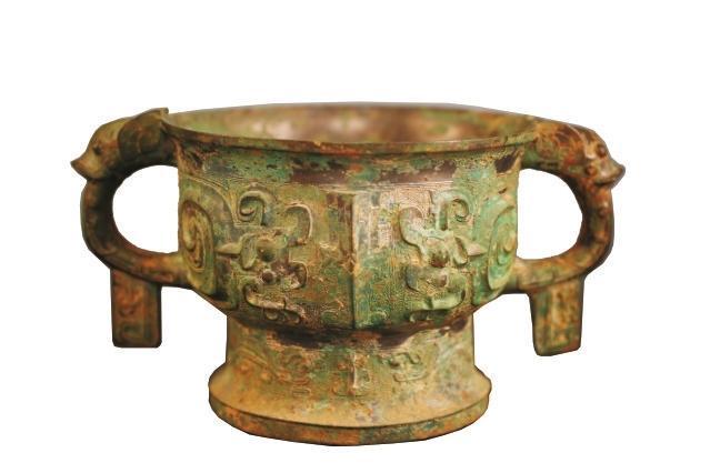 器物保存完整,紋飾十分講究,造型圖案十分精美,為國家一級文物。通高14.6厘米,口徑19厘米,底徑14.3厘米。鑄造工藝在西周時(shí)期屬于較為上乘之作。夔紋是圖騰紋飾,《說文》中云:“夔如龍而一足。”簋的兩邊為耳,呈環(huán)狀。上部各有一變形的龍首,顯得十分莊重、大氣。整個(gè)器物周身布滿綠銹,脫銹之處露出青銅光澤,透出歷史的厚重之美。