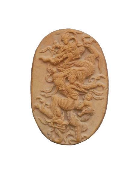 1990年出土于莊浪縣水洛鎮(zhèn)寺坪塬遺址。高11.7厘米,寬7.9厘米,厚1.5厘米,呈橢圓形。泥質(zhì)紅陶,背面平素。畫面表現(xiàn)的是某神話故事,正面飾淺浮雕紋飾,正中為一巨龍張牙舞爪、怒目圓睜、奮力騰空,一女神左手緊抓龍角,右手持劍欲砍龍首;龍頸部有一女神拿繩索套縛,另一女神在龍胸部作拔劍狀;一力士則用力拽龍尾,凸目張嘴,聲色驚恐萬分;在龍的后肢旁還有一女神右手握劍砍殺。五神皆神態(tài)各異,造型逼真,生動(dòng)表現(xiàn)了五神伏龍時(shí)驚心動(dòng)魄的場景。