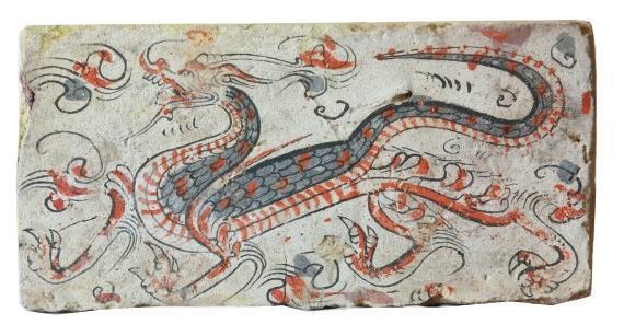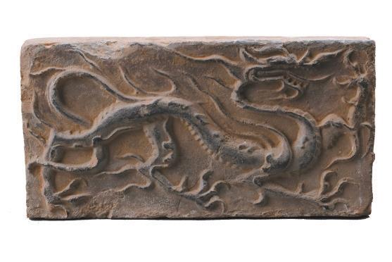 磚面上龍的形象棱角分明,骨架清瘦。龍身前屈后伸,起伏轉(zhuǎn)折,龍首高昂,張口吟嘯。前肢呈登騰狀,后肢做行進(jìn)狀。鬣鬃飛揚(yáng),揚(yáng)爪攪尾,四爪如鷙,整條龍動(dòng)態(tài)十足,形象逼真,為五代時(shí)期模印花磚中的精品。