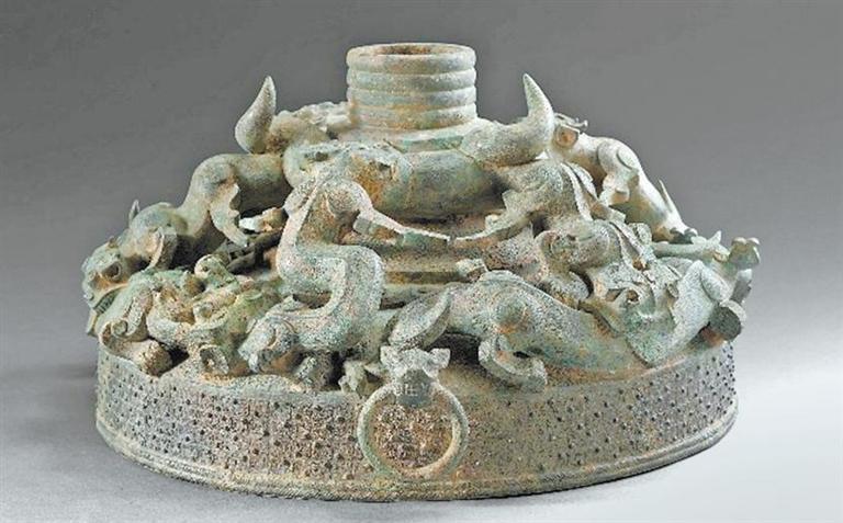上海博物館收藏的鏤空蟠龍紋鼓座,高30厘米,重37.9千克,在半球體的鼓座面上,分別攀爬有12條大小不一、相互噬咬的圓雕蟠龍。其中三條龍的龍首和龍身朝下,龍尾盤繞于插鼓柱的圓筒周邊,龍口咬住圈足上攀爬之龍的龍身;三條龍的龍首和龍身彎曲朝上,龍尾盤繞于圈足之上,龍口咬住朝下之龍的尾部;三條龍繞鼓座一周攀爬于圈足上部,龍口咬住朝上之龍的龍尾。在其翹起的龍尾下分置有三條小龍,小龍的龍首作圓雕形,口銜圓環(huán),龍?bào)w則以高浮雕的形式置于鼓座面上。大龍雙目圓形中空,可能原有鑲嵌物,現(xiàn)已遺失。龍角的兩端為空槽,可能也曾有類似的裝飾物。在鼓座基座的立面上,還刻有眾多蟠龍紋。