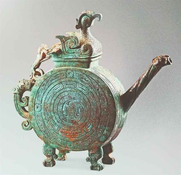 陜西寶雞出土的逨盉,酷似現(xiàn)代的扁圓形壺,器身呈扁圓形,長方形口上有鳳鳥形蓋。鳳鳥引首高昂,喙微卷曲,振翼欲飛。器身與蓋用虎形鏈及雙環(huán)相連,虎作向上爬行狀,頭左偏而尾上卷。直管狀流,流端作龍首狀。鋬呈龍首向下噴水狀,下有四獸足。腹部?jī)蓚?cè)紋飾相同,分別由三圈組成,由外向內(nèi)依次為變體夔龍紋、重環(huán)紋和蟠龍紋。逨盉是祭祀禮器,它將天上飛的鳳鳥、地上跑的猛虎、水里游的蛟龍,作為溝通天地、人神的使者,使天地人三者合而為一。由于周人將動(dòng)物視為具有無限神力之神靈,因此青銅器上之動(dòng)物紋樣,除宗教祭祀意涵外,也富有一定的政治意義。貴族通過青銅器上神秘肅穆的動(dòng)物紋樣,令人望之崇敬生畏,以威嚇被統(tǒng)治者,達(dá)到鞏固本身地位及權(quán)威之目的,同時(shí)也含有龍騰虎躍鳳呈祥的美好寓意。