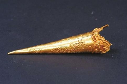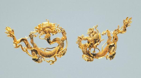 所有龍紋,都是先把黃金掐出細(xì)細(xì)的金絲做出輪廓,然后用顆粒較大的金珠沿中脊金線焊接形成連珠式“龍脊”,再用顆粒較小的“金粟”填充龍身。龍紋之間裝飾流線狀的云氣紋。
