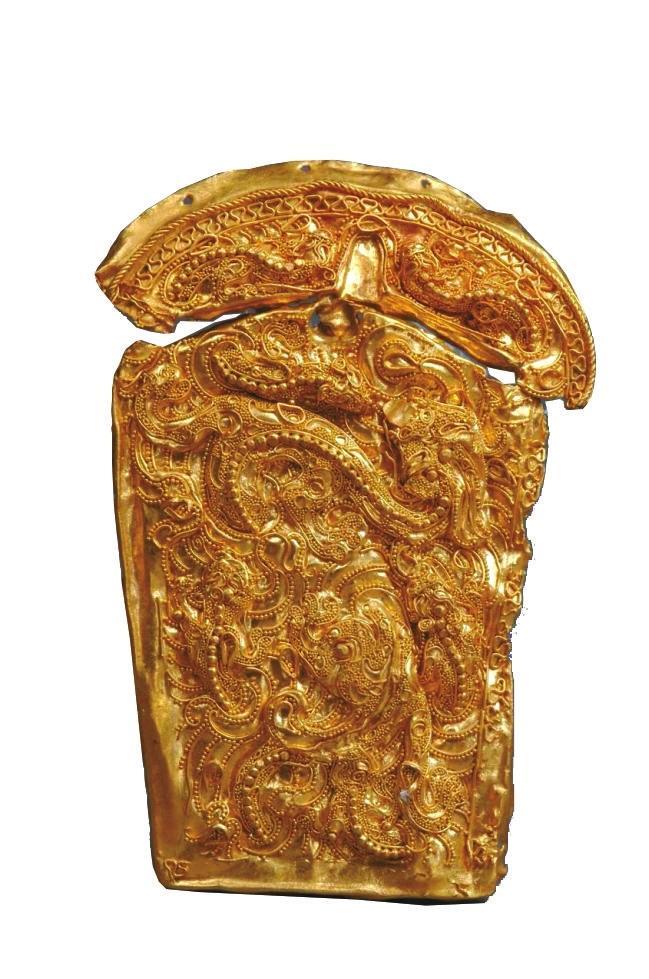 這件帶扣以黃金為質(zhì),應(yīng)用多種黃金加工工藝打造而成。整件帶扣以金皮捶揲顯出七條龍的輪廓。