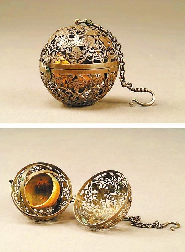 香囊最出彩的地方是機(jī)環(huán)常平架技術(shù),是一種利用球體內(nèi)兩個(gè)同心機(jī)環(huán)與中央焚香盂之間的重力作用,使其在自由轉(zhuǎn)動(dòng)的時(shí)候,始終能保持平衡的機(jī)械原理。唐代的香囊豐富多樣,這種金屬造型的香囊設(shè)計(jì)更為機(jī)巧精致,深受妃后、貴婦們所推崇喜愛,它上承漢代的常平架技術(shù),下延現(xiàn)代陀螺儀萬向支架技術(shù),是中國古代科學(xué)技術(shù)與手工藝技術(shù)對(duì)世界的杰出貢獻(xiàn)。