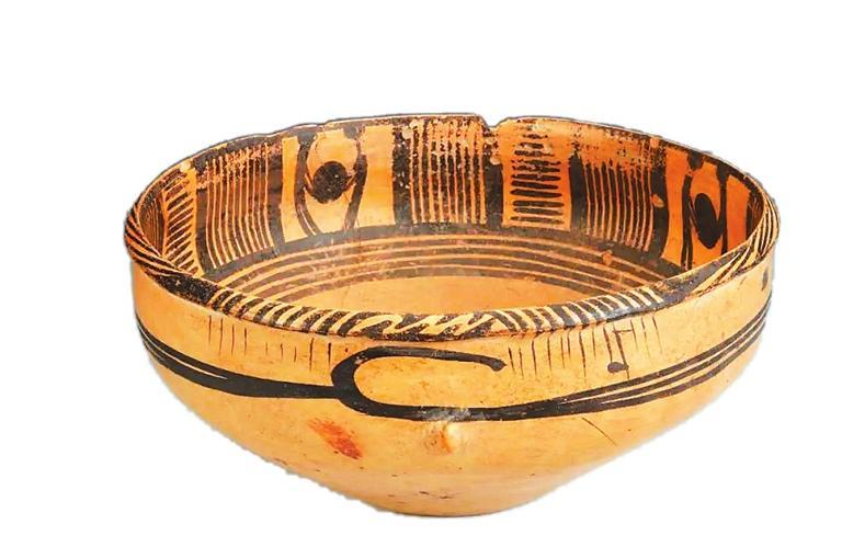 這件距今5000多年的古代彩陶作品,制作精致,圖案精美,人物形體鮮明,造型和動(dòng)作既抽象又生動(dòng)。彩陶盆通高11.3厘米,口徑24.5厘米,底徑9.8厘米,細(xì)泥制作,唇外侈,略鼓腹,腹部兩側(cè)有對(duì)稱的小鈕。口沿內(nèi)壁為四組雙人抬物圖案,中間以橫豎線條組成的幾何圖案間隔,形成一周四方連續(xù)的紋飾帶,繪制于陶盆內(nèi)側(cè)上部,二人的頭部以圓點(diǎn)代表,軀干和四肢以線條描繪。兩人相向站立,共同抬起一個(gè)碩大的圓形物體,畫面簡潔而生動(dòng),寥寥數(shù)筆就將人抬重物時(shí)雙腿開立、腰背微屈用力的形態(tài)刻畫得惟妙惟肖。陶盆上精妙的紋飾讓它成為我國最早在彩陶上表現(xiàn)原始先民勞作場(chǎng)景的藝術(shù)珍品。