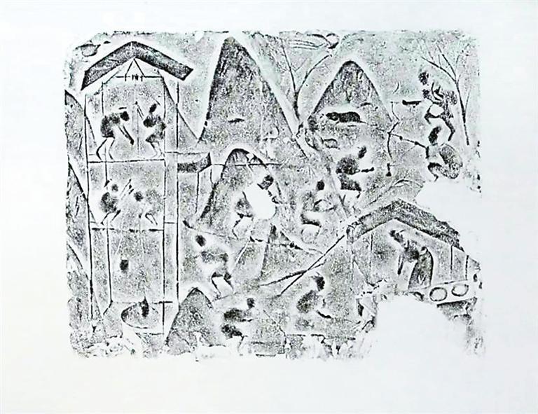巴蜀地區(qū)是中國乃至世界鹽業(yè)最早的起源地之一,史載戰(zhàn)國時(shí)期巴蜀就已開鑿鹽井、汲鹵煮鹽。秦在此設(shè)鹽官,至漢代,四川地區(qū)的井鹽制作已經(jīng)具有一定的規(guī)模,分工細(xì)致,工具完備。此畫像磚表現(xiàn)了漢代制鹽的情景:畫面左下角有高聳的井架,架上安置有轆轤,用以轉(zhuǎn)動(dòng)系在繩索上的吊桶,交替吸鹵,高架旁有一鹵槽,將鹵引入煮鹽的釜內(nèi),釜下架設(shè)有灶,有人正奮力用扇燒起熊熊烈火。