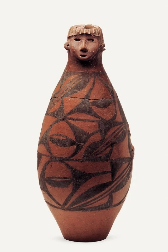 隴東少女作為甘肅的“顯眼包”之一,是曾在《國(guó)家寶藏》中出現(xiàn)過的“網(wǎng)紅”、甘肅省博物館鎮(zhèn)館之寶,它于1973年從秦安縣大地灣遺址出土。具有高度審美能力的“托尼”老師,設(shè)計(jì)了齊劉海發(fā)型,顯得很泰酷辣,圓鼓腹、平底,人們細(xì)看發(fā)現(xiàn),陶人的兩眼為圓孔洞,顯得目光深邃;鼻子呈蒜頭形,雕有鼻孔;嘴較小,微微張開,好像正在言語;兩耳外展,皆有穿孔;瓶體從上至下以黑彩飾三層大小相同、由弧線三角紋和斜線組成的二方連續(xù)圖案,以示華麗的衣物。另外,陶瓶人頭像的器口運(yùn)用了不同的制作手法,頭發(fā)、嘴系雕刻而成,鼻、臉是捏塑而成。人頭像五官整齊、面龐秀麗,器身造型典雅,與人物形象渾然一體,既是大地灣文化彩陶的代表作,也是中國(guó)史前集彩繪、雕塑與造型藝術(shù)于一身的杰作。估計(jì)任誰看一眼,都會(huì)被“她”的神秘和美麗所吸引吧。