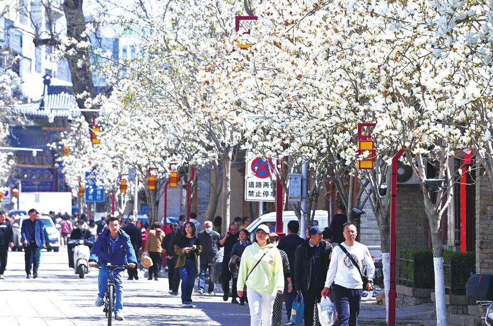 ▲天水秦州古巷里盛開(kāi)的玉蘭花,讓游客駐足觀(guān)賞。