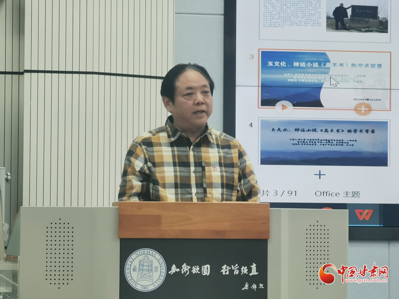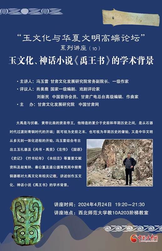 4月24日晚,馮玉雷講座“玉文化、神話小說《禹王書》的學(xué)術(shù)背景”在西北師范大學(xué)舉辦。這次講座是甘肅文化發(fā)展研究院和中國甘肅網(wǎng)聯(lián)合舉辦的“玉文化玉華夏文明高端論壇”系列講座第十講,也是近期啟動(dòng)的“巡禮馬銜山:玉文化與文學(xué)融合發(fā)展”系列活動(dòng)之一,甘肅文化發(fā)展研究院常務(wù)副院長、一級(jí)作家馮玉雷主講,國家一級(jí)編劇、戲劇評(píng)論家肖美鹿,中國音協(xié)會(huì)員、甘肅廣電總臺(tái)高級(jí)編輯、作曲家劉新民擔(dān)綱學(xué)術(shù)評(píng)議嘉賓。