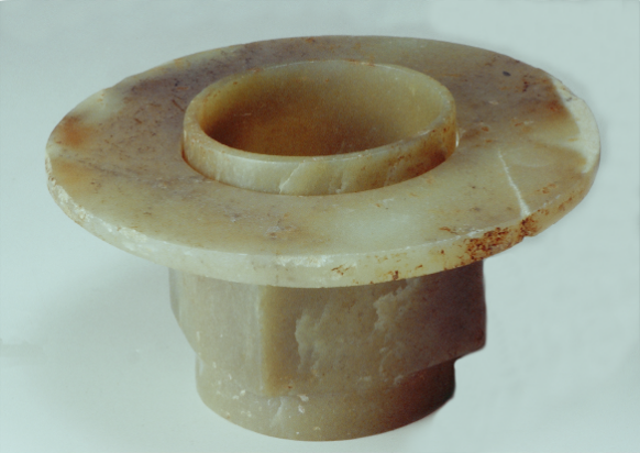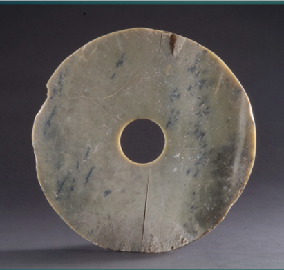 玉璧(編號總0129:5)直經(jīng)9厘米,單面鉆孔,大端孔徑4.4厘米,小端孔徑4厘米,厚度0.55—0.7厘米,璧外緣有磕碰痕。